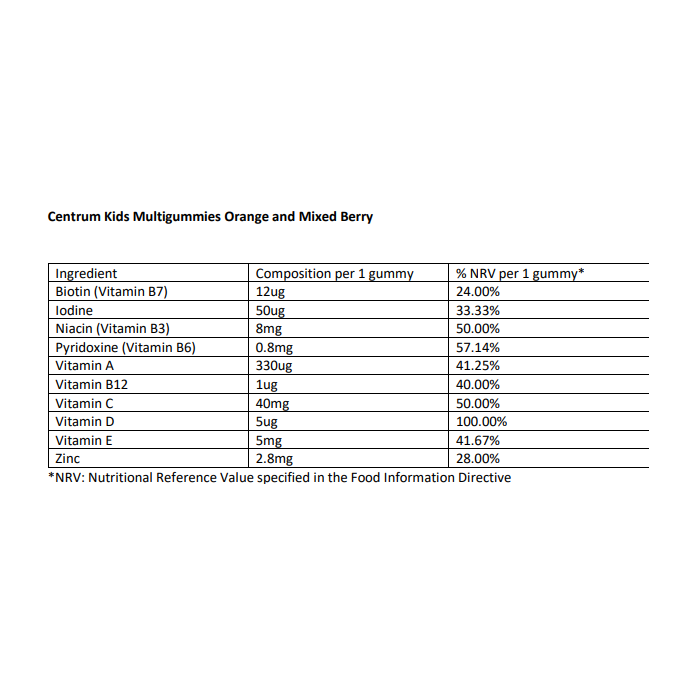 Centrum Kids chewable Multigummies Orange & Mixed Berry has been developed by experts, to combine important nutrients in an easy-to-take and deliciously fruity supplement for Kids 4+.