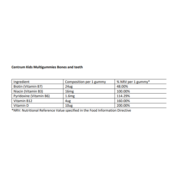 Centrum Kids Bones & Teeth chewable gummies have been developed by experts, to combine important vitamins in an easy to take and deliciously fruity supplement for Kids 4+.