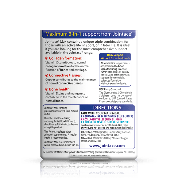 Jointace Max gives you triple support with Collagen, Glucosamine, Turmeric, Chondroitin and Omega-3 in one box. Cartilage and bone health are important for overall wellbeing. Jointace Max includes trace minerals, vitamins and nutrients ideal for those with an active lifestyle.