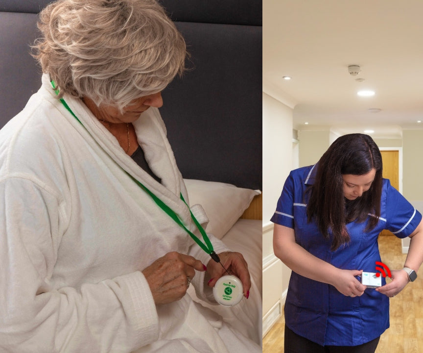It is a standalone system that includes two call buttons and one caregiver pager. When pressed, the nurse call buttons send a wireless signal to the pager, alerting the caregiver that assistance is required.