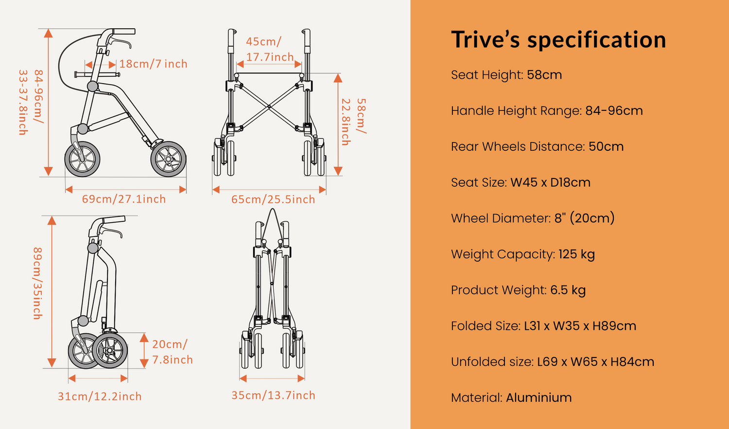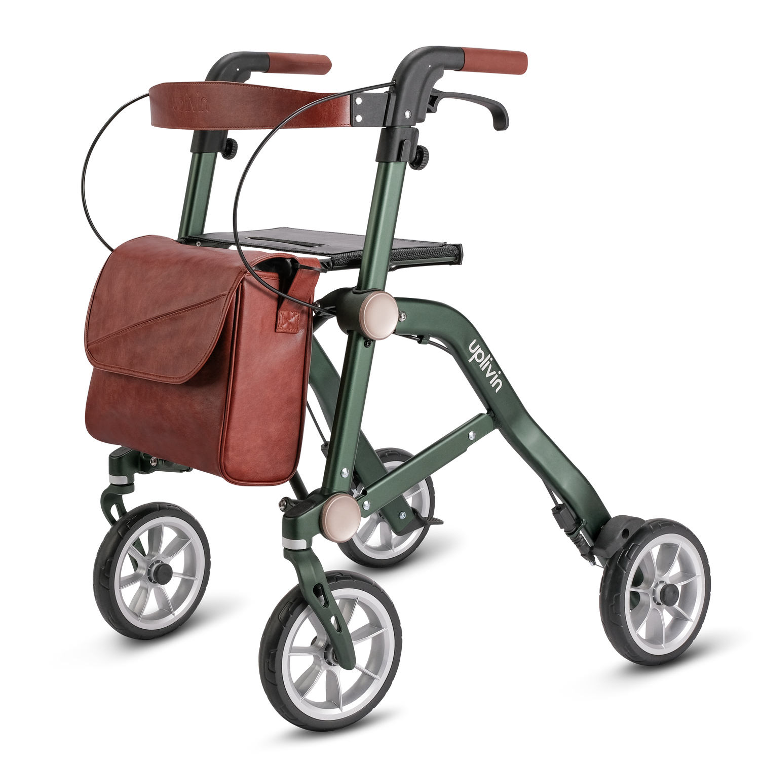 The Trive Compact Folding Rollator offers portability without compromising on style. This double-folding rollator is easy to carry and can be stored in small spaces. Sophisticated yet affordable, the Trive is a mobility aid you can be proud to own.