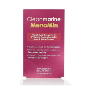 With this unique all-in-one Omega 3, Phytonutrient and Vitamin blend, Cleanmarine MenoMin has been formulated specifically to give extra nutritional support for peri-menopausal and menopausal women. Cleanmarine MenoMin food supplement is rich in Omega-3 with Phospholipids, Vitamins B1, B2, B6, B12 and D3, as well as Rosemary Extract, Soy Isoflavones, Folate and Biotin. With Vitamin B6 to help regulate hormonal activity, biotin to help maintain normal mucous membranes, as well as Vitamin B2 to reduce tiredness and fatigue and Vitamin D to help maintain healthy normal bones.